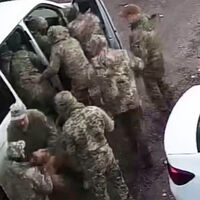 На опубликованных изданием кадрах видно, как около десяти мужчин в камуфляже силой усаживают мужчину в микроавтобус, после чего передают ему его собаку, закрывают дверь и уезжают.