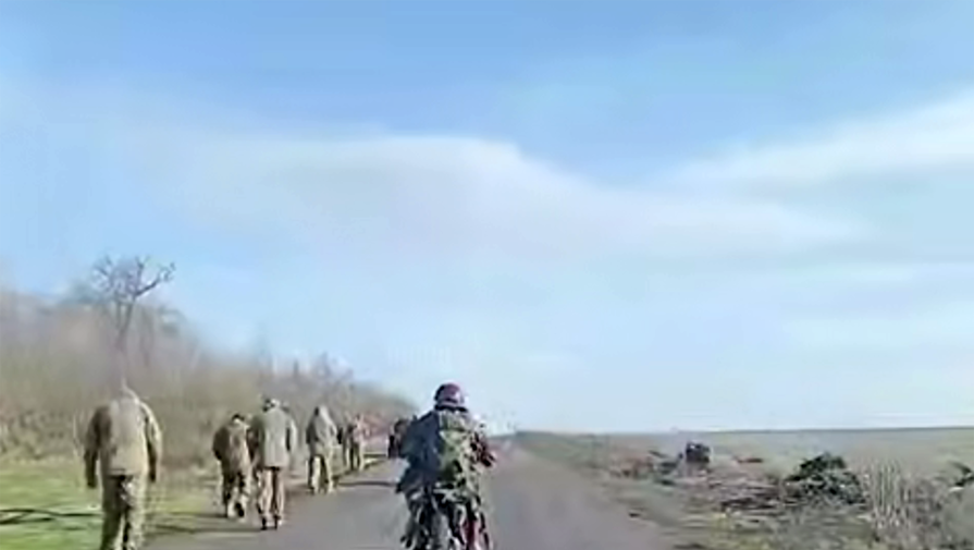 На опубликованных кадрах российский штурмовик, передвигаясь на мотоцикле, снял на видео колонну из украинских солдат (около 15 человек — прим.ред.), которых конвоируют на багги.