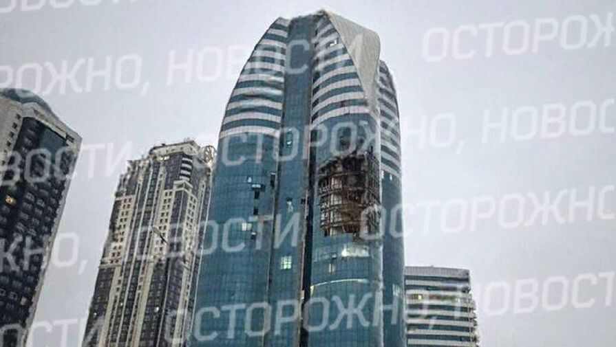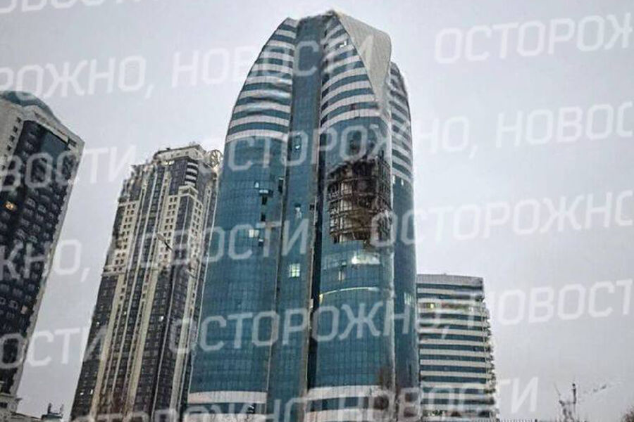 В Чечне комплекс «Грозный-Сити» подвергся атаке беспилотных летательных аппаратов. Кадр с поврежденным зданием опубликовал Telegram-канал «Осторожно, новости», ссылаясь на местные оппозиционные каналы.