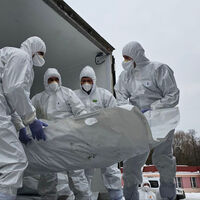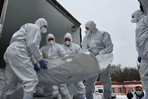 На снимке запечатлены люди в белых защитных костюмах и респираторах, которые выносят мешок с одним из тел из грузовика, где находятся такие же пакеты.