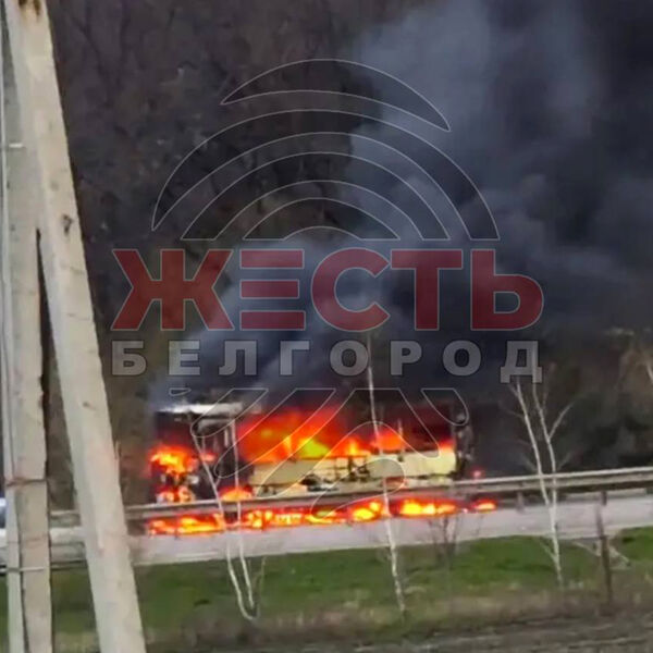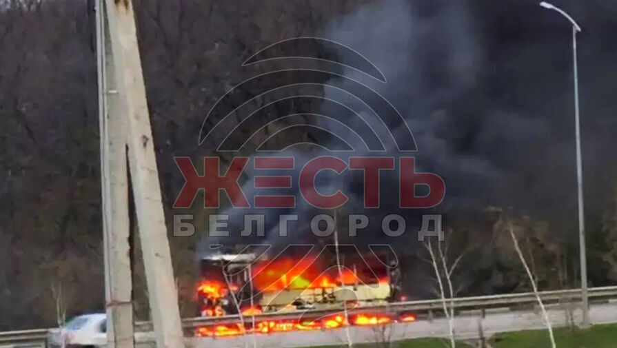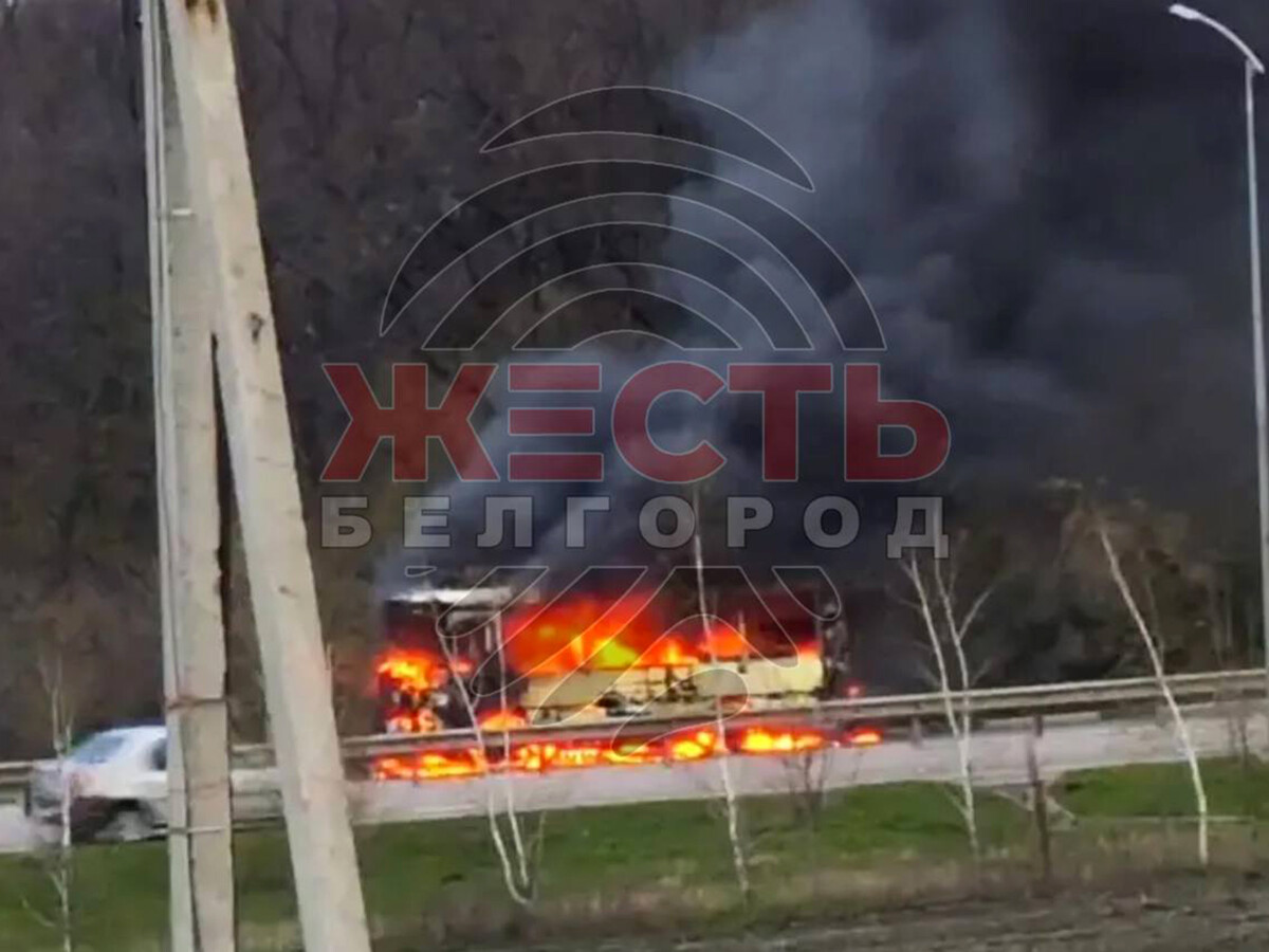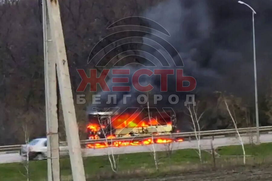 Telegram-канал «Жесть Белгород» опубликовал кадры с места происшествия. На них видно, как на трассе полыхает атакованный автобус.