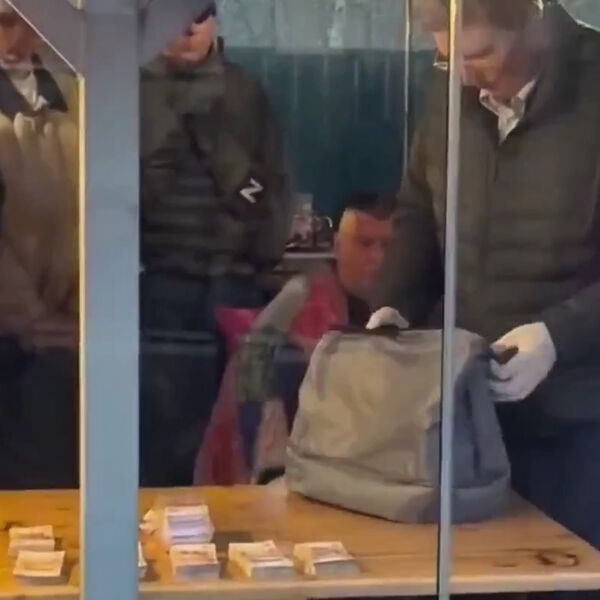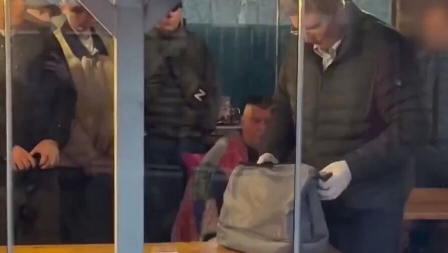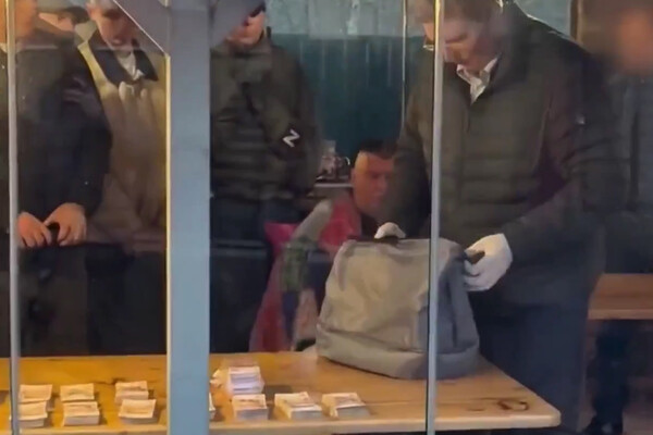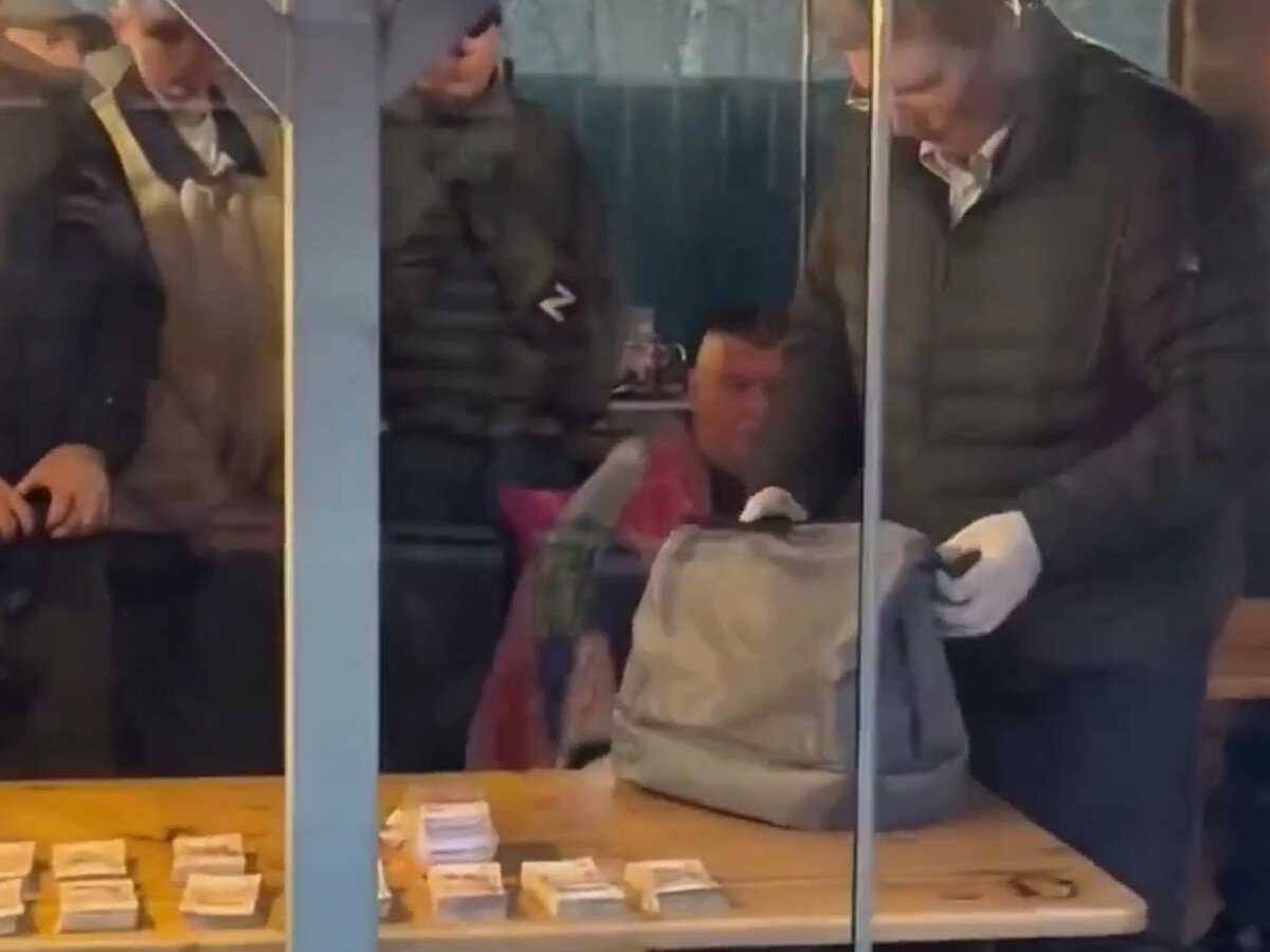 На видео показано, как один из следователей проверяет серый рюкзак в перчатках. При этом на столе лежат пачки купюр.