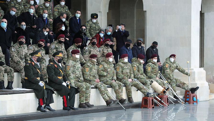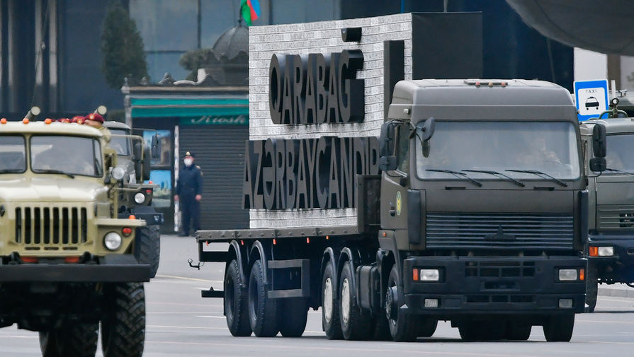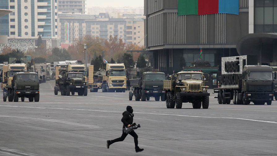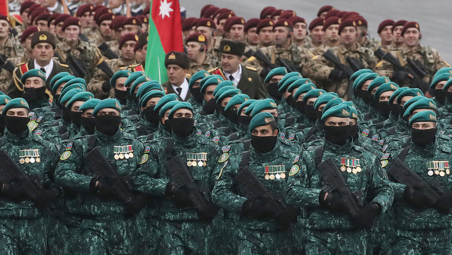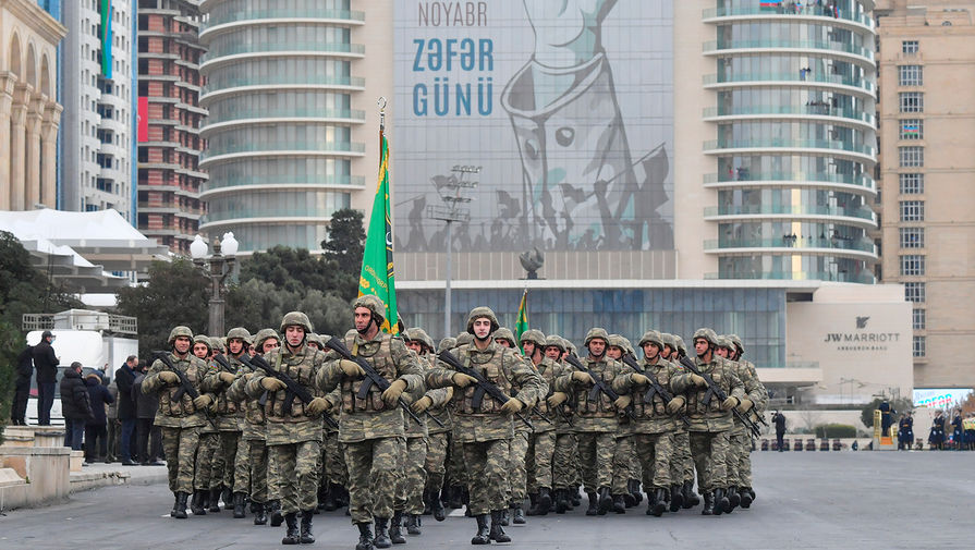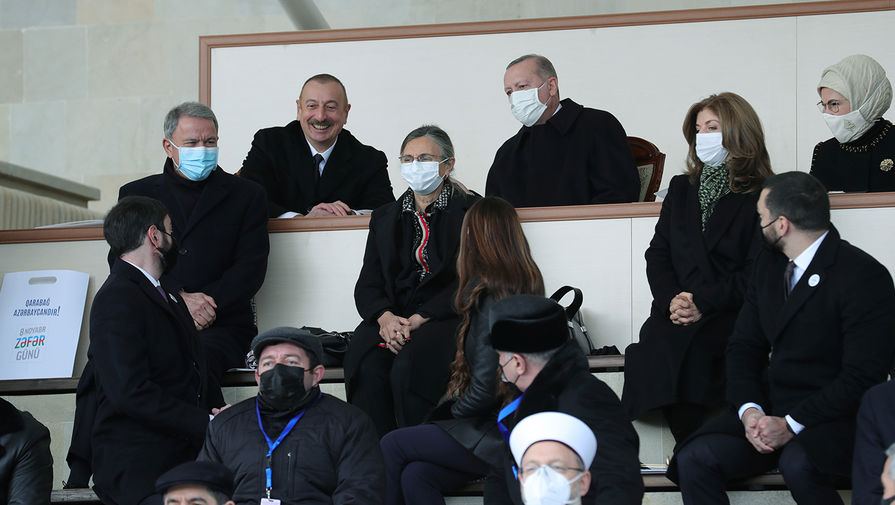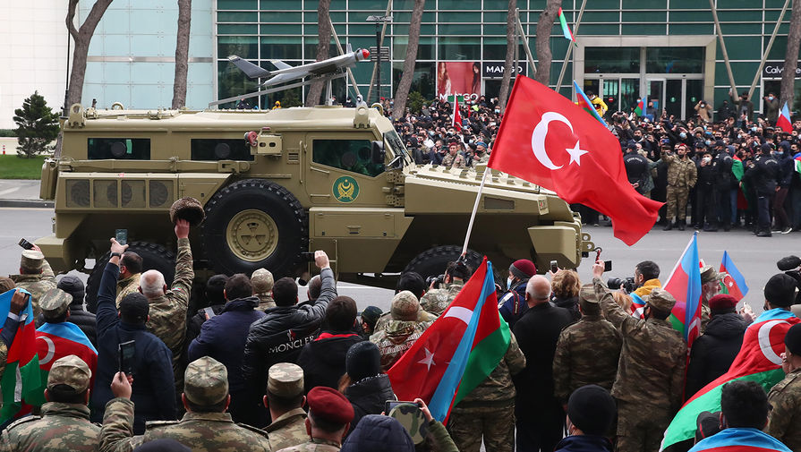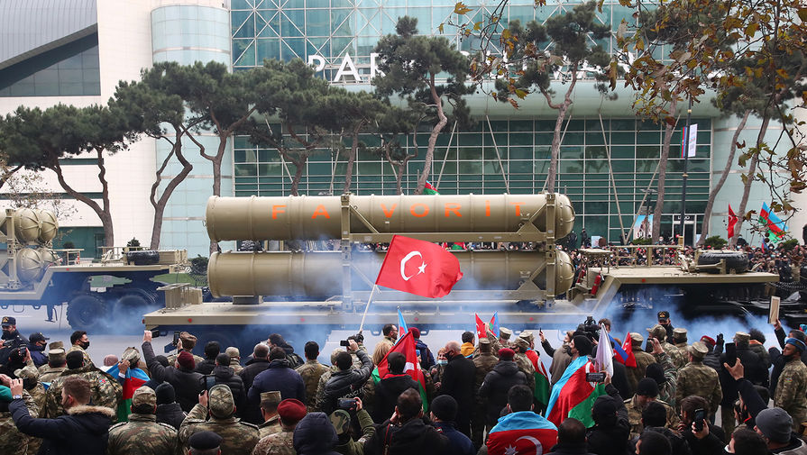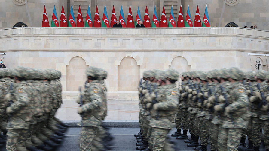 В Баку состоялся масштабный военный парад, приуроченный к окончанию конфликта в Нагорном Карабахе. Помимо президента Азербайджана Ильхама Алиева, с трибуны за парадом наблюдал президент Турции Реджеп Тайип Эрдоган, турецкие военнослужащие также присутствовали на мероприятии.