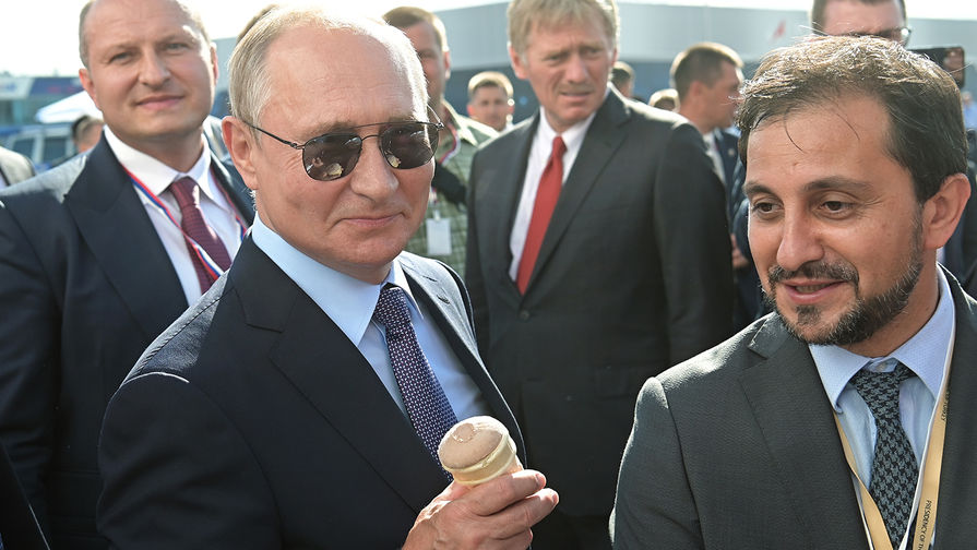 Кроме того, Путин по традиции съел на авиасалоне стаканчик мороженого — на этот раз он купил один экземпляр и для турецкого коллеги, расплатившись пятитысячной купюрой. Как прошла встреча Путина и Эрдогана среди самолетов — в фоторепортаже «Газеты.Ru».