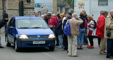 На выезде со стоянки-грядки синих и серых «Логанов» оказывается невесть откуда взявшийся автобус с иностранцами. К тому же французами. Галдящая толпа пенсионеров вываливает из «Неоплана» и перекрывает дорогу невиданному ими творению французского автопрома, повисает на крыше, ощупывает и осматривает достопримечательности салона. Технический персонал еле уговаривает освободить дорогу. Расходятся неохотно.