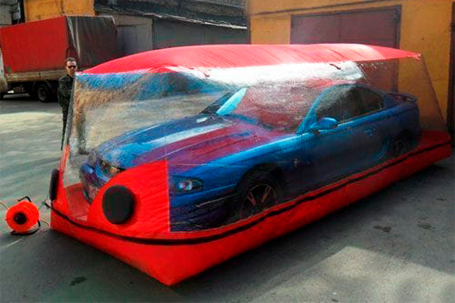 По задумке китайцев, защитить машину от чего-либо падающего сверху призван надувной гараж. Перед тем как спрятать автомобиль в такой бокс, необходимо разложить на месте остановки пластиковую основу, далее к ней на молнии пристегивается прозрачный чехол из ПВХ.