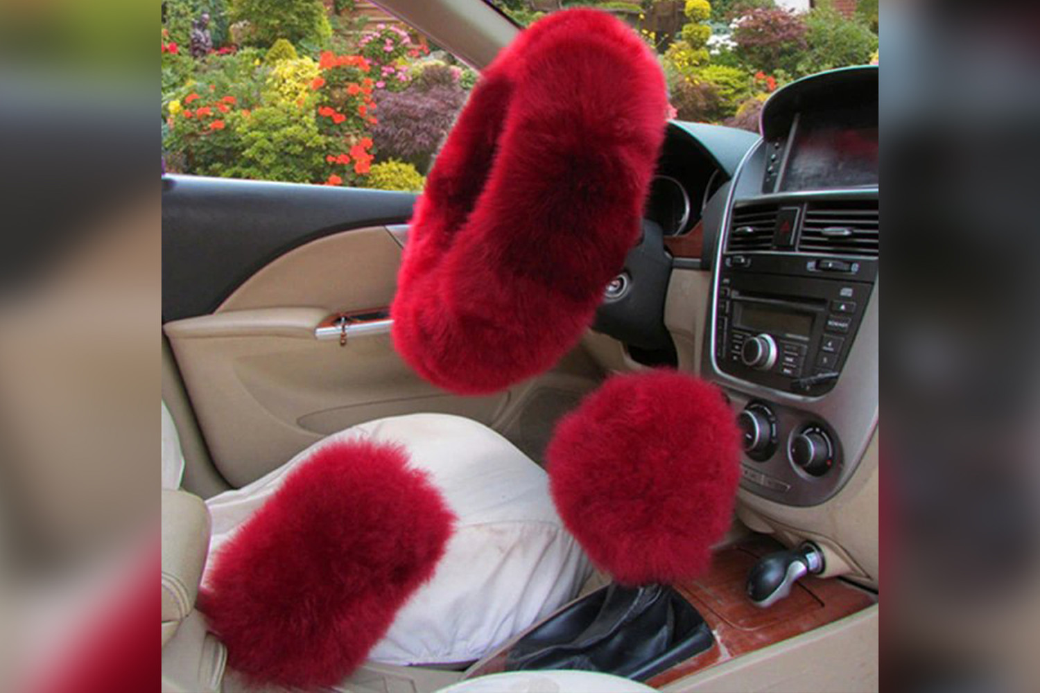 Пушистая оплетка на руле, чехлы на ручку селектора коробки передач и рычаг стояночного тормоза якобы позволяют создать более уютную атмосферу в автомобиле.