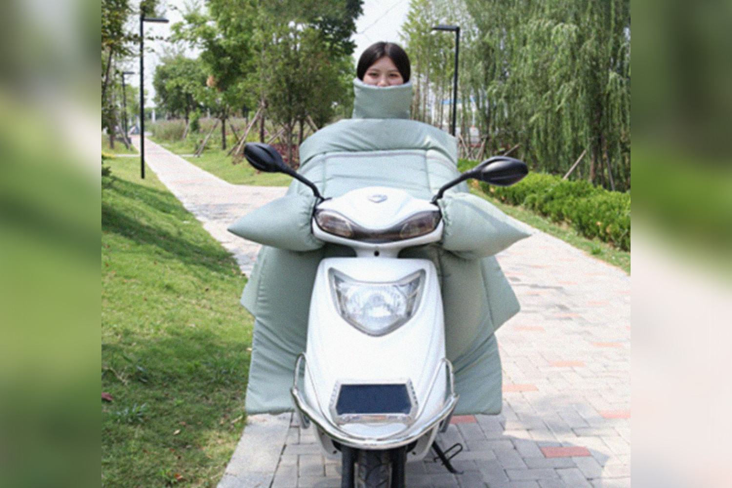 Любителям зимних поездок на мопеде адресован утепленный плащ-кокон. Как пишут китайские производители, влагонепроницаемая накидка с двухслойным утеплителем не деформируется под потоком набегающего воздуха и выдерживает даже сильные морозы.