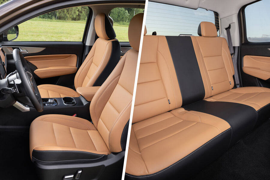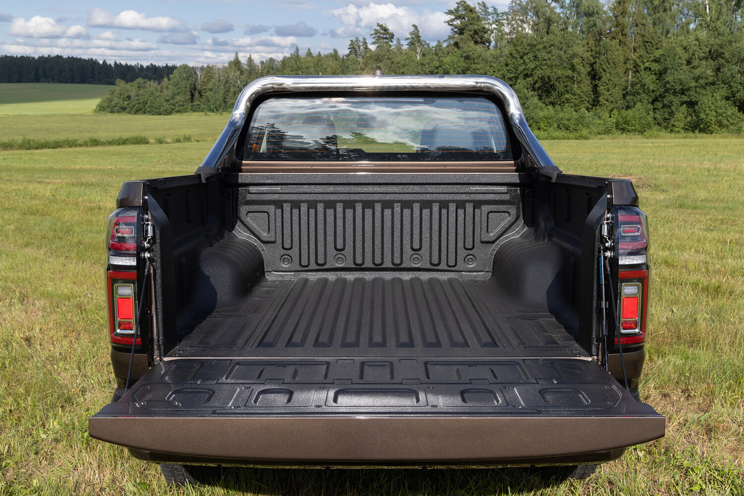По интерьеру и эргономике китайский пикап тоже не подкачал: стильная экокожа сидений, аккуратный и приятный на ощупь пластик, очень много места для водителя и переднего пассажира. При этом задние седоки также не обделены жизненным местом, спинка у «дивана», понятное дело, практически вертикальная, но это беда всех пикапов.