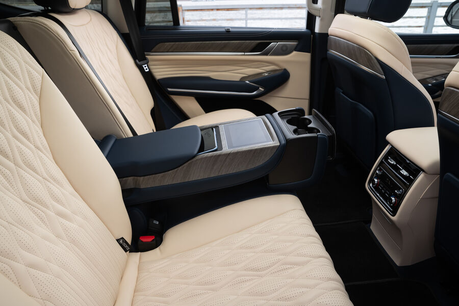 В подлокотнике заднего дивана смонтирован сенсорный пульт управления микроклиматом и медиасистемой, а также беспроводная зарядка для смартфонов.