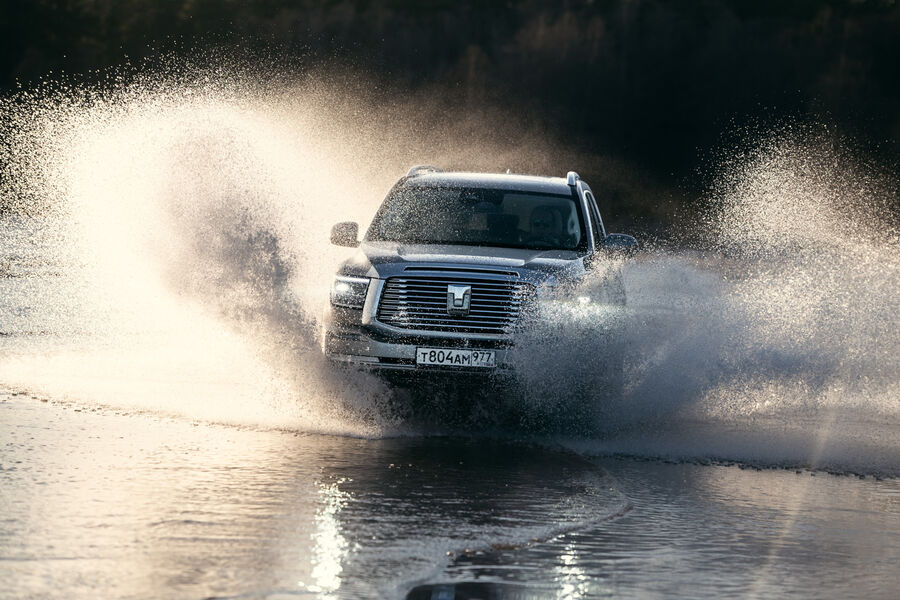 На специально оборудованных внедорожных препятствиях Tank штурмует брод, переваливает через бетонный бруствер и преодолевает каменистый участок: раздаточная коробка BorgWarner и межколесные блокировки Eaton включаются бесшумно и работают как положено.