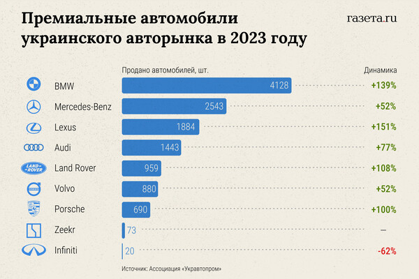 В сравнении с массовыми европейскими и корейскими брендами продажи автомобилей премиум-марок на Украине в 2023 году восстанавливались значительно интенсивнее.