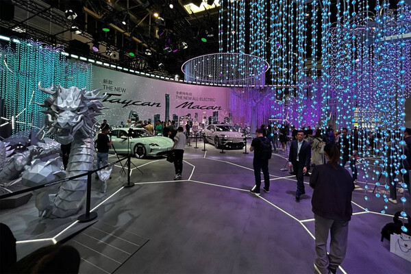 Именно так сейчас выглядит стенд Porshe. Вдалеке стоят электрические Macan EV и Taycan.