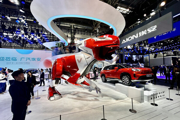 На Пекинском автосалоне Aion, электромобильный суббренд GAC Motor, решил представить модель Aion V в красном оттенке вместе с огромным роботом-динозавром такого же цвета.