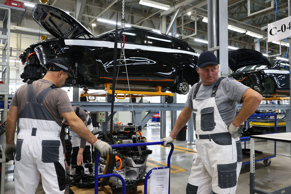 Рабочие во время сборки автомобиля Evolute i-sky на конвейере на заводе компании «Моторинвест»