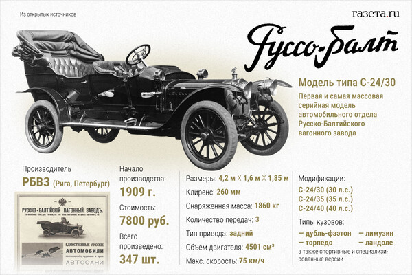 Таких автомобилей было сделано всего 17. Наиболее же распространенным был «Руссо-Балт» с открытым кузовом «торпедо» — за 9 лет завод выпустил 285 таких машин.