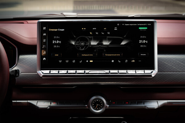 По центру передней панели установлен 16-дюймовый дисплей мультимедиа. В меню можно детально настроить потоки климатической системы, память кресел, свет, степень демпфирования пневмоподвески и усилие на руле, а также отключить или наоборот, активировать системы помощи водителю. Большие сенсорные часы под монитором с секретом: вместо стрелок или цифр на экран можно вывести кнопку запуска двигателя.