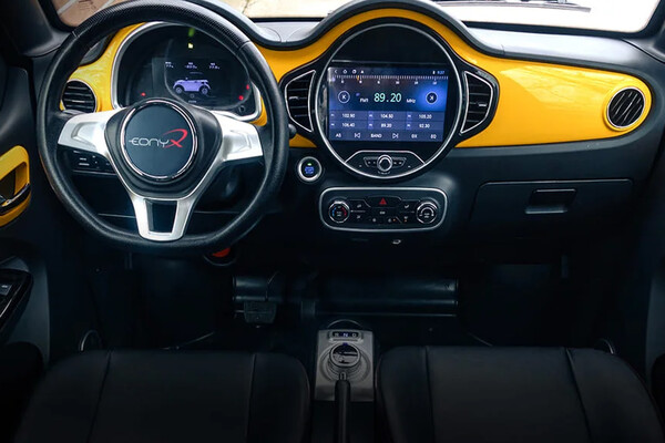 Для двухместного пассажирского Eonyx M2 с дизайном в стиле британского Mini Countryman заявлен запас хода до 130 км. Полностью зарядить машину можно за восемь часов от бытовой розетки. Длина машины 2860 мм, ширина 1500 мм, высота — 1566 мм, у электромобиля задний привод.