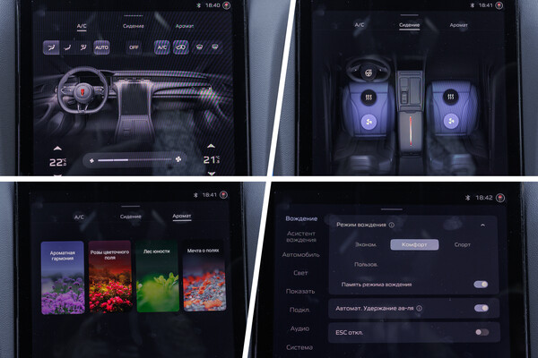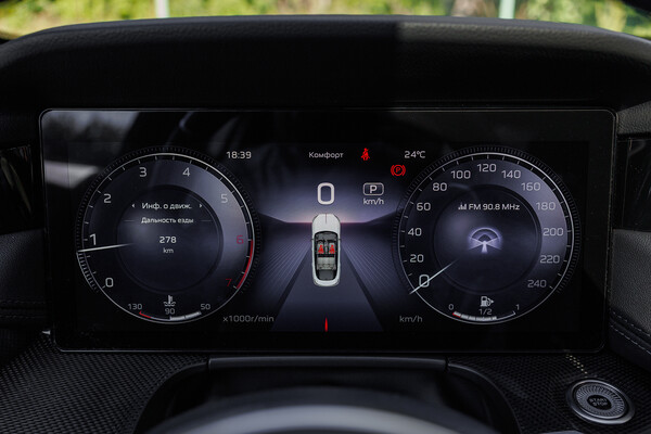 Например, нет поддержки Apple CarPlay и Android Auto — интеграцию со смартфонами производитель обещает реализовать позже. Туда же стоит адресовать и пожелания по русификации некоторых разделов меню. К примеру, не сразу можно понять, что «ощущение церемониальности» в разделе «Свет», как раз и включает ту эпичную подсветку алых флагов на внешних контурах автомобиля. А виртуальные кнопки «ПО» и «АО» в разделе «Вождения» относятся к мягкому и плотному режиму подвески.