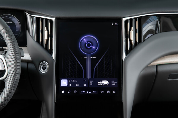 Командный пункт управления всем — без малого 13-дюймовый вертикальный планшет. Видимо, из-за его размеров «аварийку» пришлось переместить на потолок, что неожиданно и не очень удобно. Интерфейс системы не всегда логичен, а поддержки Apple CarPlay и Android Auto все еще нет, что для эпохи 17-го iPhone — минус.