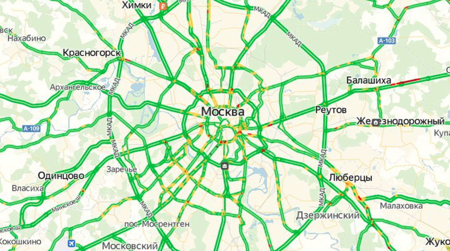 В первый день введенных в Москве карантинных мер пробки достигли 0 баллов. Об этом свидетельствуют данные сервиса «Яндекс.Карты».