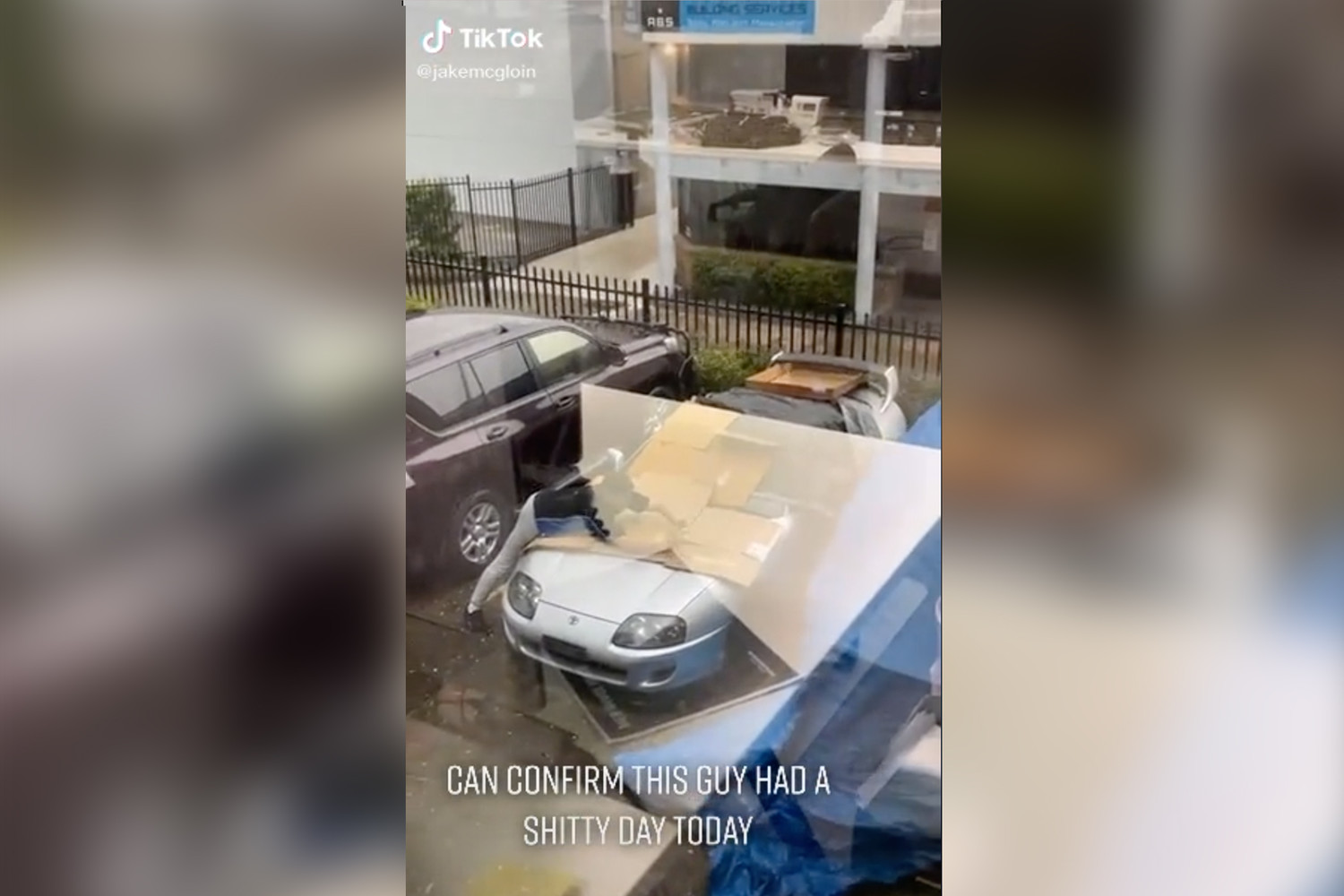 Джей МакГлоин из Сиднея снял видео из окна дома, как его сосед выбежал на улицу во время сильного града. Мужчина испугался за свой автомобиль Toyota Supra, который стоял под открытым небом.