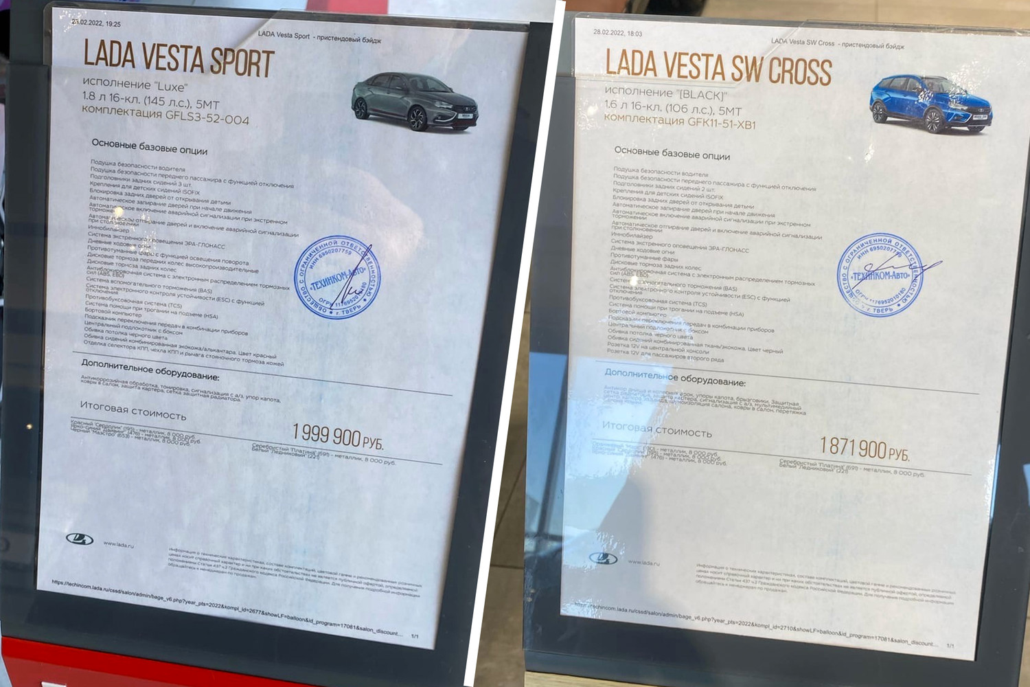 Кроме того, на фотографиях были запечатлены ценники на Lada Granta — самую доступную модель в линейке «АвтоВАЗа». Московский дилер запросил за нее больше миллиона рублей. При этом в прайс-листах отечественного производителя максимальная цена Granta в кузове лифтбек составляет почти 962 тыс. руб.