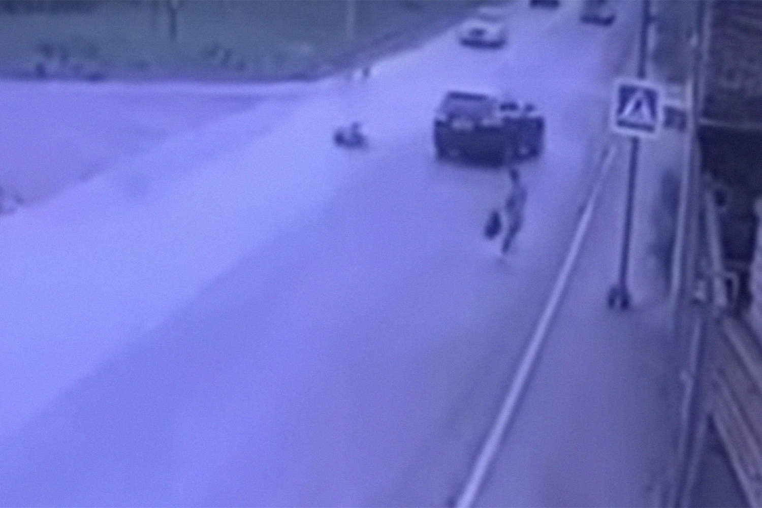 Черный внедорожник сбил девушку, переходившую дорогу в Астрахани. Видео момента ДТП опубликовал Telegram-канал «Аварии Астрахань».