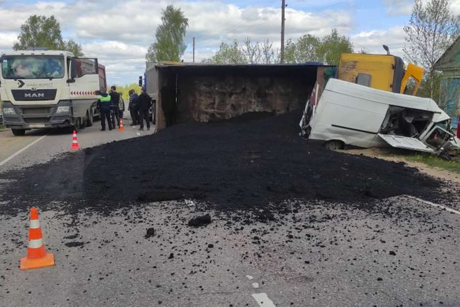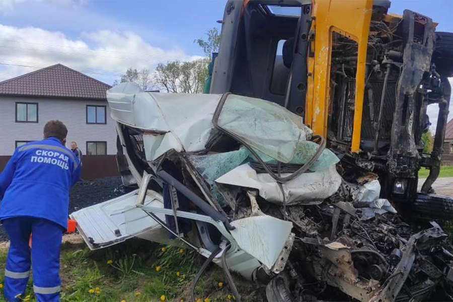 В результате ДТП водитель Ford скончался на месте. На фотографиях с места событий видно, что грузовик завалился на бок и подмял под себя микроавтобус.