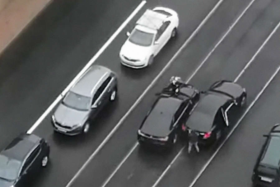 Инцидент произошел на Проспекте Науки. По дороге ехал черный седан Kia с человеком на капоте. Перед перекрестком машина остановилась и водитель попытался силой снять гражданина с автомобиля. После того, как сделать это не получилось, машина поехала дальше и врезалась в поворачивающий налево хетчбэк. Затем Kia продолжила движение. При этом человек так же висел на машине.