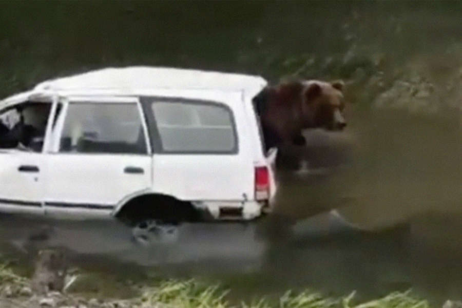Медведь залез в застрявший в реке внедорожник в поисках еды на Сахалине. Видео опубликовано в Telegram-канале Fishing island Sakhalin.