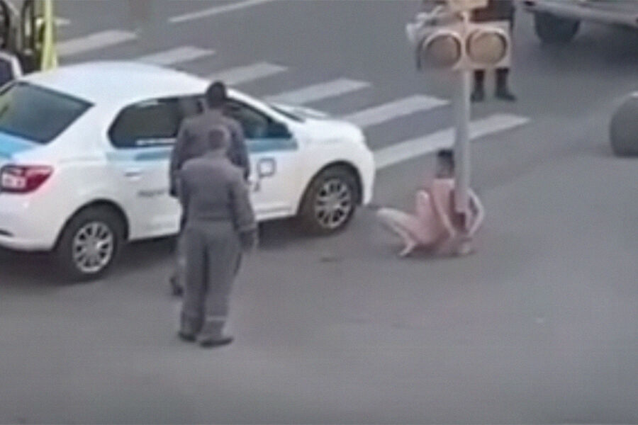 Судя по кадрам, кто-то приковал его наручниками к светофору, предварительно сняв всю одежду. Мужчина сидит на корточках, пытается встать, но это у него не получается.