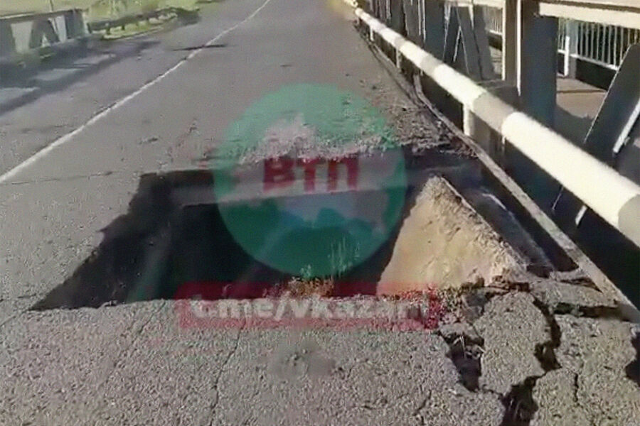 В Татарстане на автомобильном мосту образовалась дыра из-за провала плиты, видео с места происшествия опубликовано в Telegram-канале «ВТатарстанеПоймут».