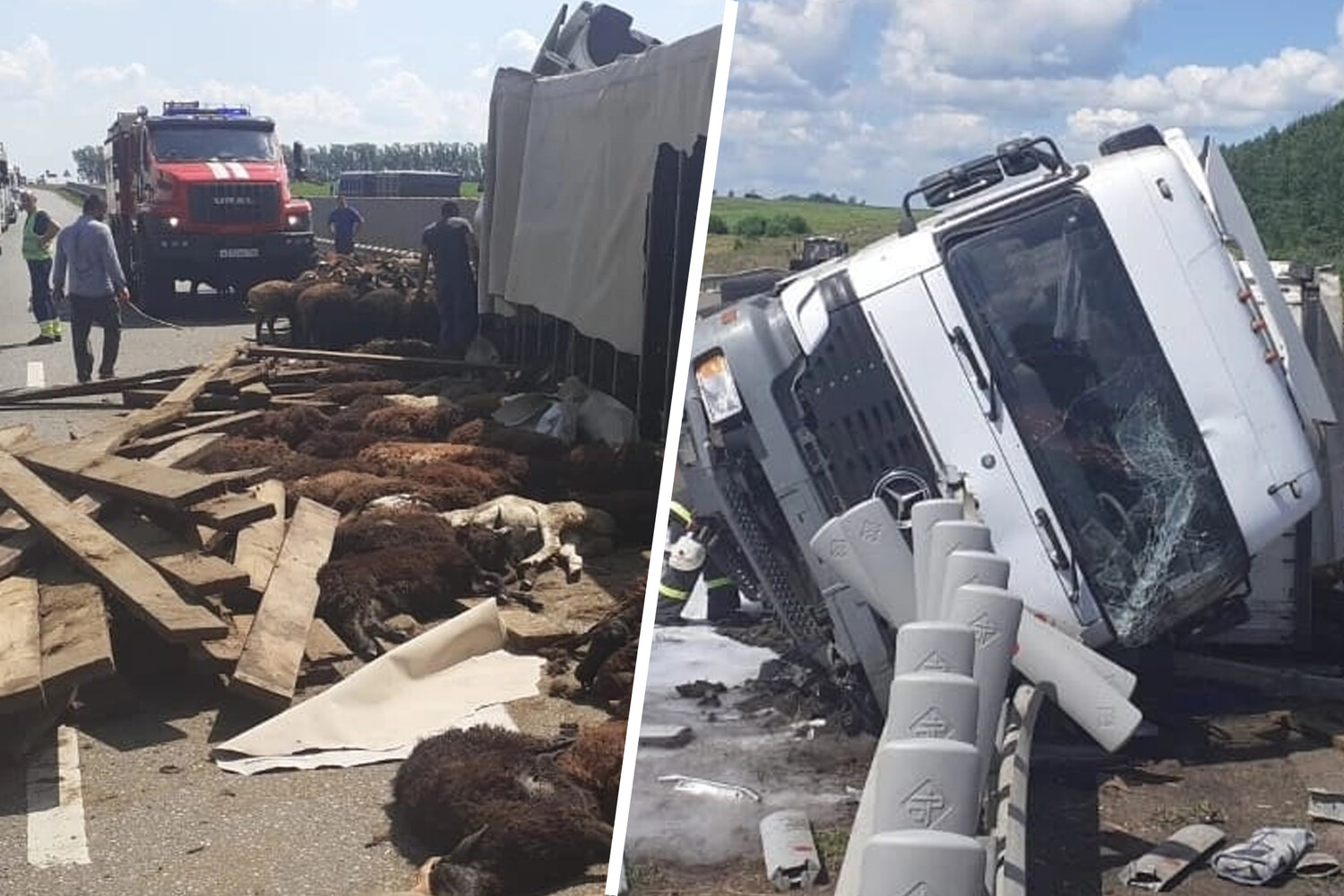 В Башкирии грузовик, перевозивший около 200 баранов, врезался в металлический отбойник и завалился на бок, сообщает издание «Подъем».