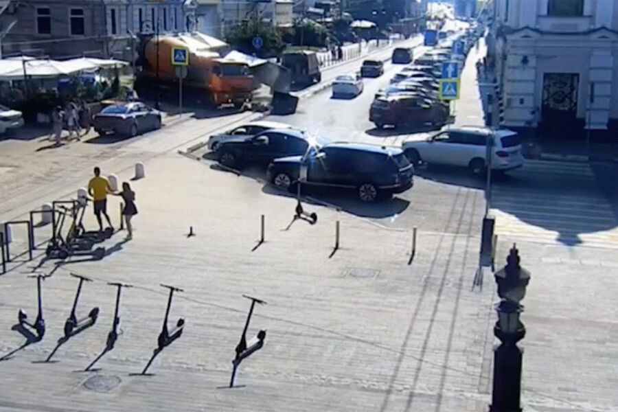 Машина скатилась с Почтового съезда на ул. Рождественскую, попутно врезавшись в три автомобиля, павильон для мусорных контейнеров и фонари освещения. После этого, автомобиль выехал на тротуар и остановится.