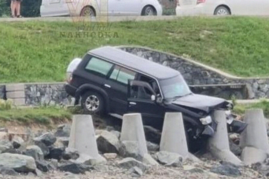 Инцидент произошел на пляже в городе Находка. Женщина за рулем серебристого внедорожника Toyota Land Cruiser Prado не справилась с управлением и протаранила внедорожник Nissan Safari, который от удара скатился с откоса, пересек пешеходную зону и застрял прямо у кромки воды. Препятствием для попадания автомобиля в море стали бетонные волнорезы, установленные на берегу, а также скопление камней. О пострадавших в ДТП не сообщается.