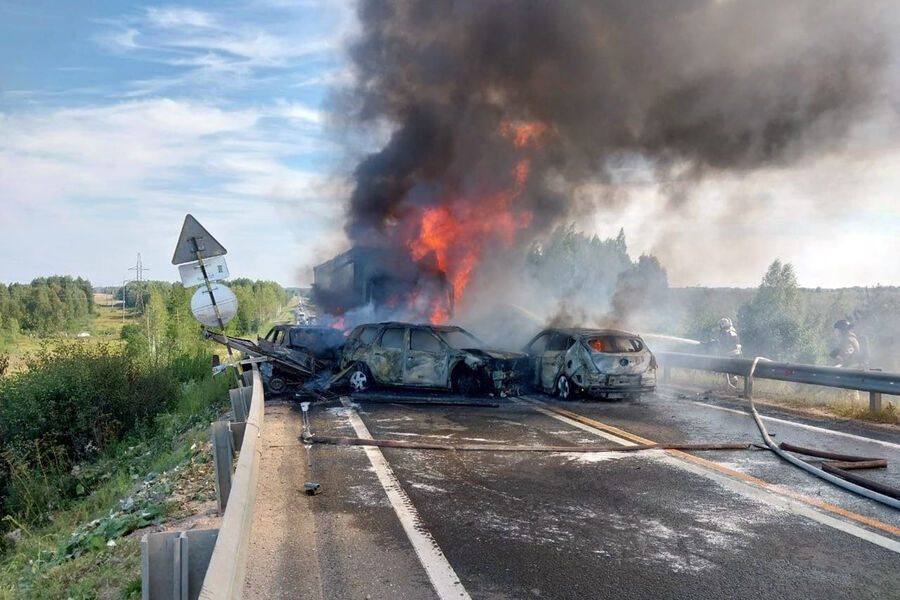 Авария произошла в 19 км от города Кириллов на мосту через Кишемский канал. Отмечается, что фура на полном ходу врезалась в очередь из попутно стоящих автомобилей. После удара машины загорелись. Всего сгорело семь транспортных средств.