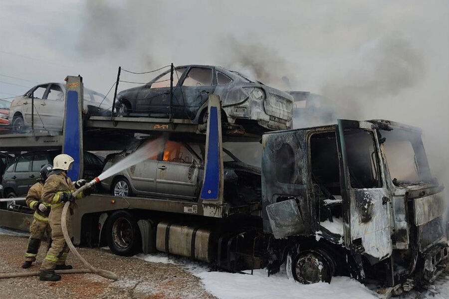 В каждом автовозе находилось по восемь новых автомобилей Lada. Как рассказали спасатели, помимо грузовиков сгорели шесть машин Lada Granta, а два внедорожника Niva получили механические повреждения.