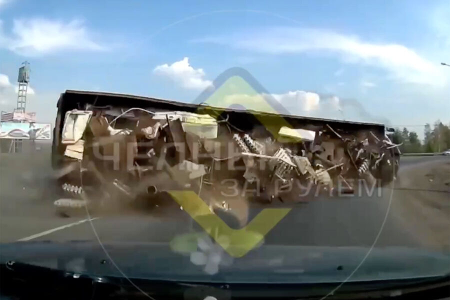 Фура перевернулась и засыпала металлоломом дорогу в Набережных Челнах. Видео инцидента опубликовал Telegram-канал «В Татарстане Поймут».