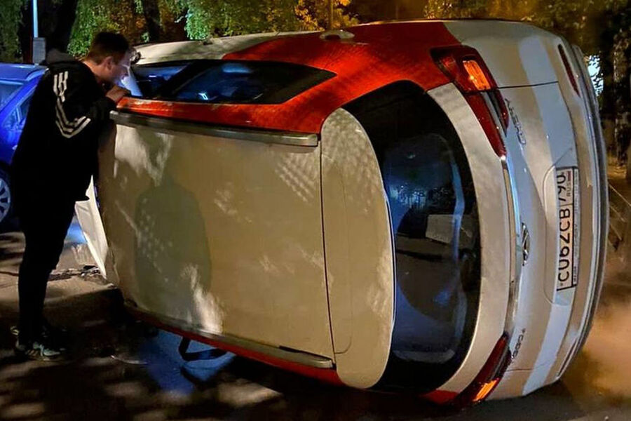 Инцидент произошел в ночь на 11 сентября дома №8 по Ореховому бульвару. Арендованный автомобиль Chery столкнулся с тремя припаркованными машинами, вылетел на тротуар и завалился на левый бок.