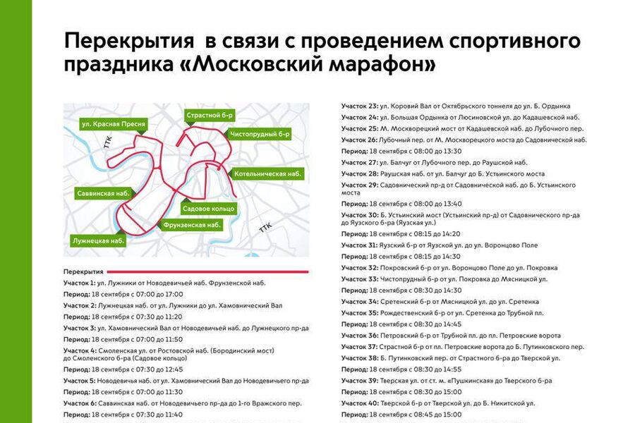 С 7:00 будут перекрыты улицы Лужники, Тестовская, Мантулинская, а также будет ограничено движение на Краснопресненской, Смоленской, Ростовской, Саввинской, Новодевичьей и Лужнецкой набережных до конца марафона.