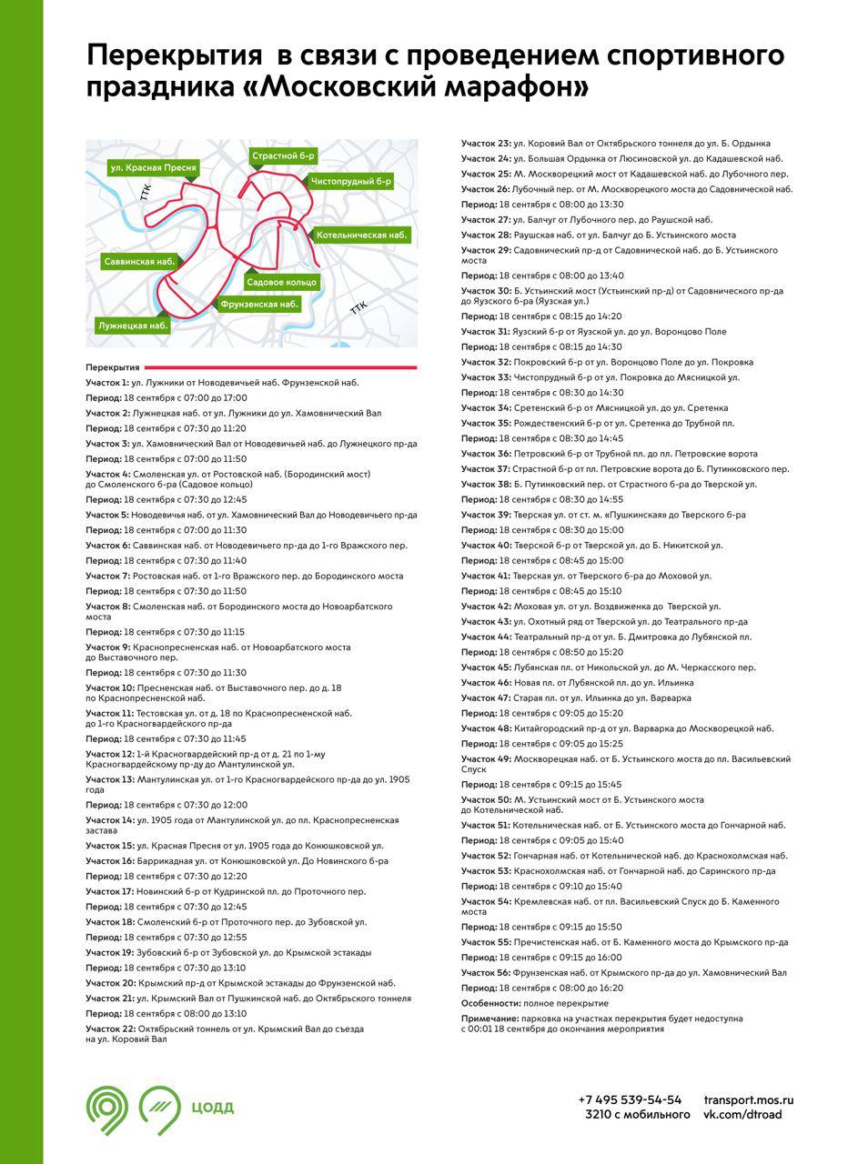 В Москве, в Центральном административном округе, ограничат движение в связи с проведением «Московского марафона» в воскресенье, 18 сентября, на нескольких улицах и набережных, сообщается в Telegram-канале «Дептранс Москвы».