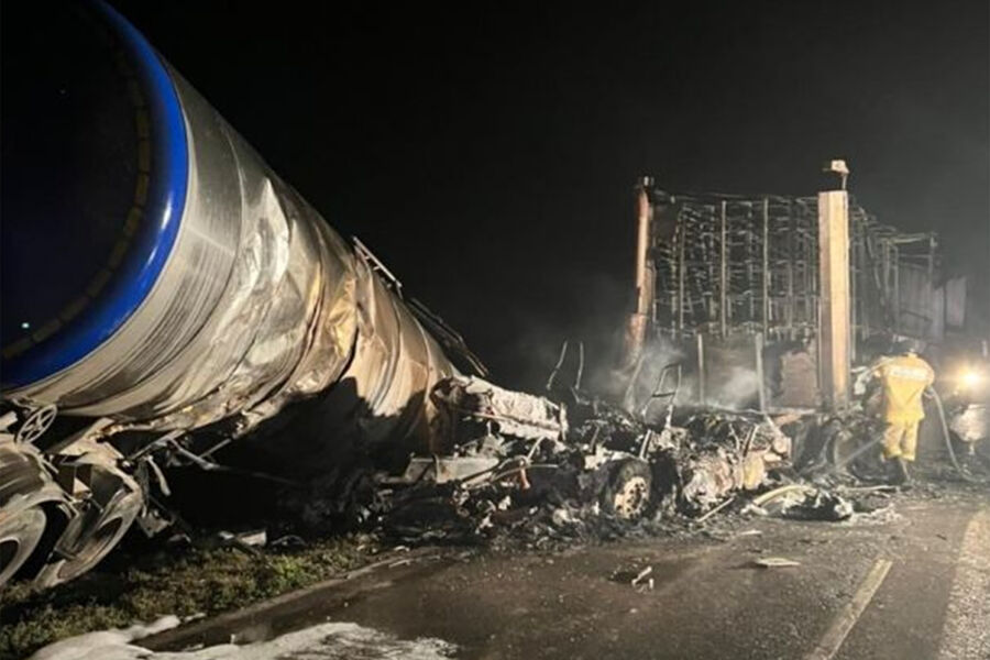 Водитель автомобиля Freightliner не смог покинуть кабину и сгорел. Отмечается, что в момент аварии цистерна Mercedes была пустой.