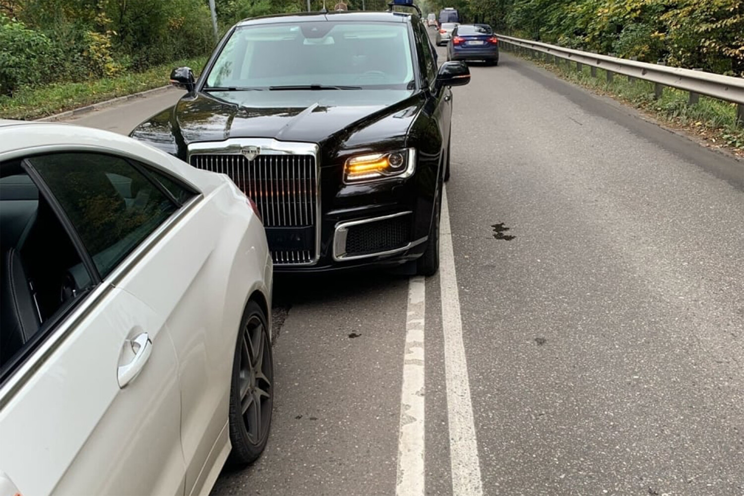 Судя по фото, обе машины получили минимальные повреждения. У Aurus и у Mercedes-Benz повреждены бамперы. Люди во время аварии не пострадали.