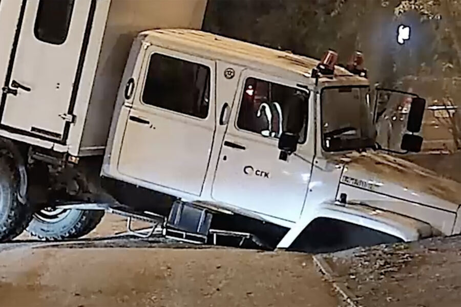 В Новосибирске автомобиль ГАЗ местных коммунальных служб провалился в яму, образовавшуюся в месте прорыва водопровода. После этого в машину въехал грузовик без водителя, сообщает Telegram-канал Mash Siberia.