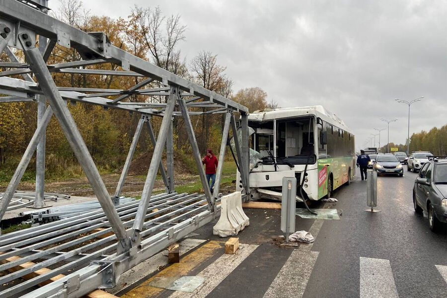 Отмечается, что сидевший за рулем автобуса водитель поздно среагировал на притормозивший у пешеходного перехода автомобиль и въехал в строящийся мост. Судя по фото, у автобуса вылетели лобовые стекла, поврежден бампер, решетка радиатора и часть крыши.