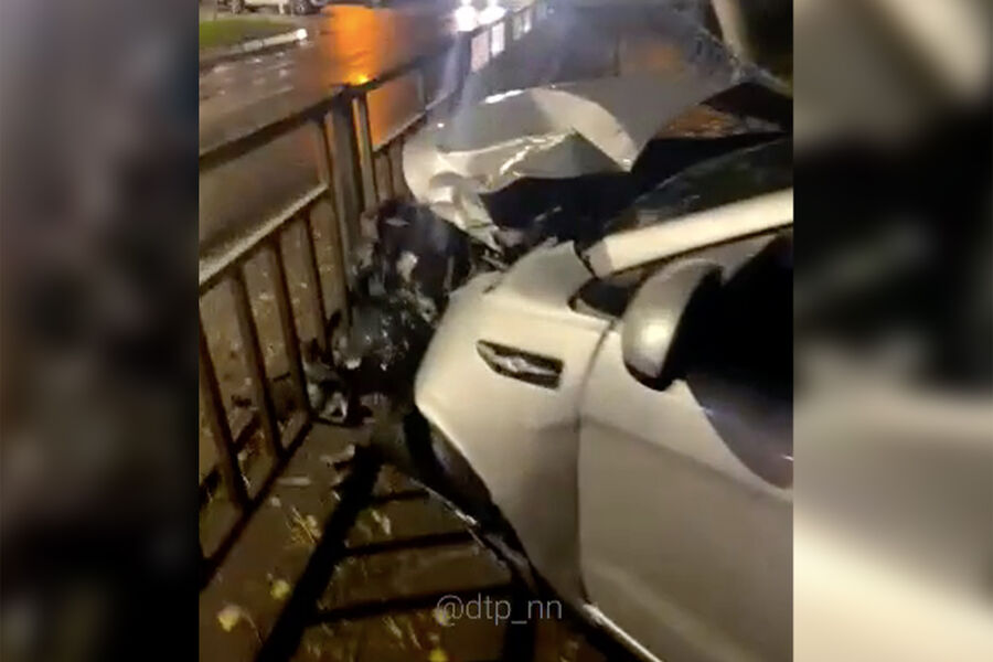 Инцидент произошел на улице Снежной. Судя по видео, автомобиль вылетел на тротуар и врезался в ограждение. У машины разбит капот, бампер, крылья, лобовое стекло. После аварии сработали подушки безопасности.