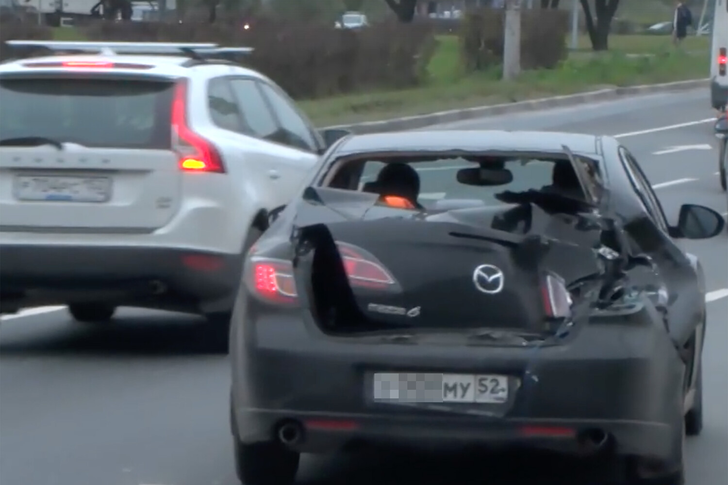 Авария произошла днем в среду, 19 октября, на улице Сергея Акимова. Судя по кадрам видео, военный грузовик «КамАЗ» врезался в автомобиль Mazda 6. У легковушки повреждена крышка багажника, заднее стекло, бампер. У грузовой машины видимых повреждений нет.