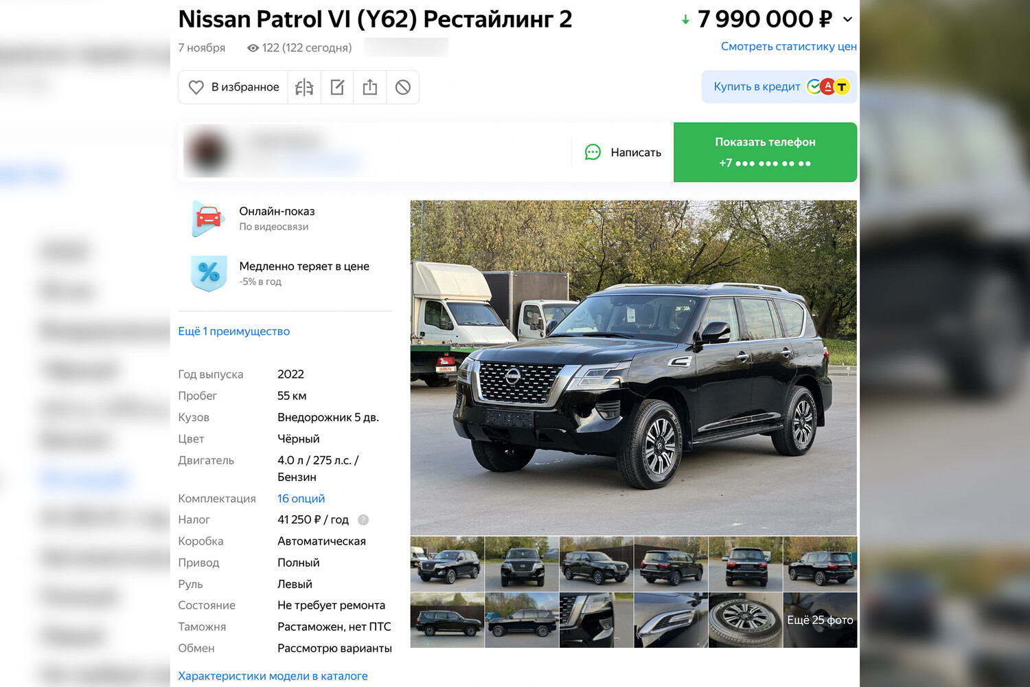 В зависимости от комплектации Nissan Patrol оснащены адаптивными фарами, мультимедиа-системой с 12-дюймовым дисплеем, креслами с функцией памяти, камерами (спереди и сзади) и прочими опциями. В некоторых объявлениях указано, что автомобиль ввезен из ОАЭ.