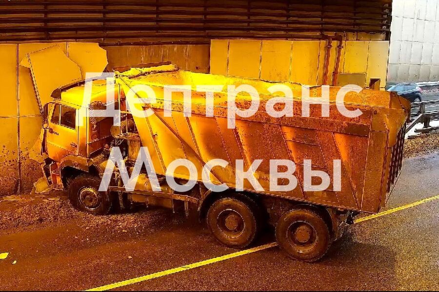 Судя по фото, самосвал «КамАЗ» по касательной врезался в облицовку тоннеля, после чего машину развернуло. От удара стеновые панели разрушились. Отмечается, что в результате дорожно-транспортного происшествия движение ограничено до одной полосы.